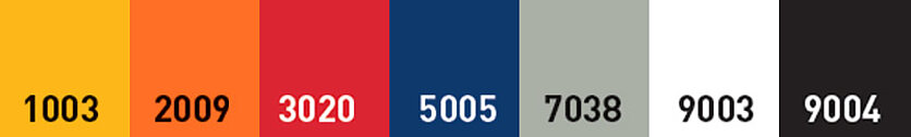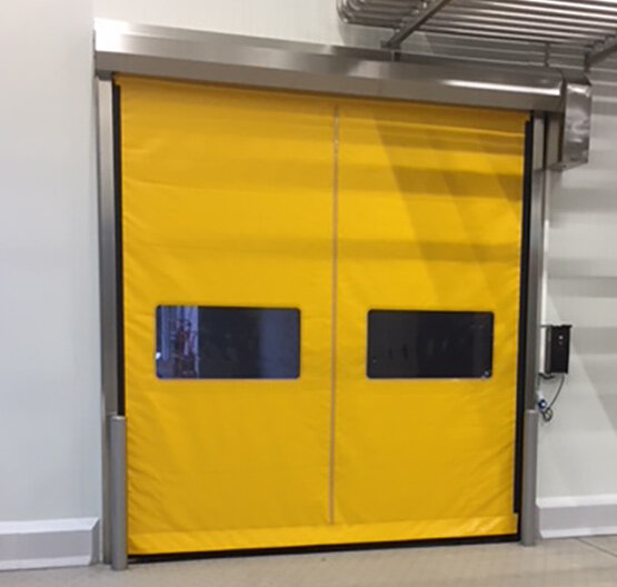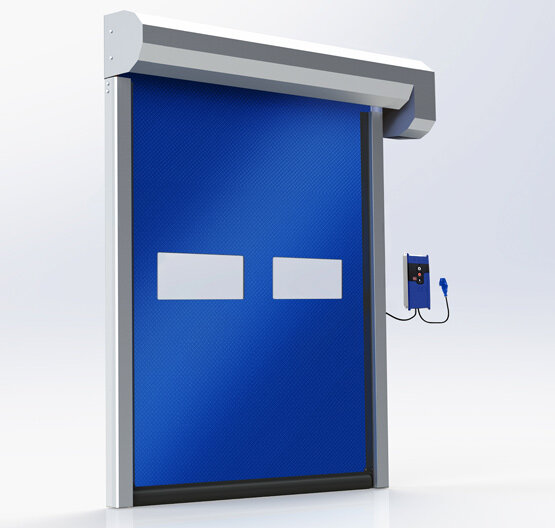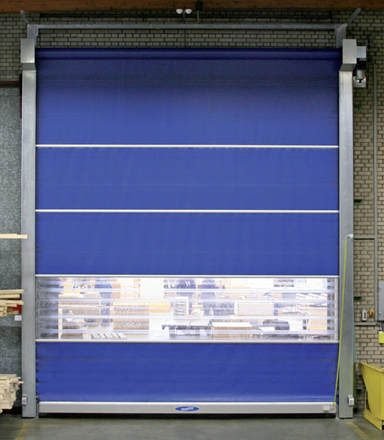 The door curtain is available in 9 colours. The door curtain can be provided with transparent windows (option). The steel guides and top cover have a white (RAL-9016) or grey (RAL-7011) powdercoating as standard, but your choise of RAL-colour is also available as an option1.