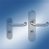 2 hinge plates, three-dimensionally adjustable (standard 3-D hinge), with hinge lock, aluminium knob-lever set as per DIN 18257 ES 1 ZA with 72 mm short plate and SI profile cylinder as per DIN 18252 BS (35 + 26 mm), safety card and three keys.