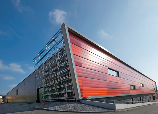 The resulting building complex is ultra-modern with a striking design, especially of the façades. The production hall is single storey with cellar space beneath some of it, while the administration including social areas is incorporated into the overall concept in a two-storey building. The total floor space of the factory exceeds 22,000 m²; more than 208,000 m³ were enclosed.